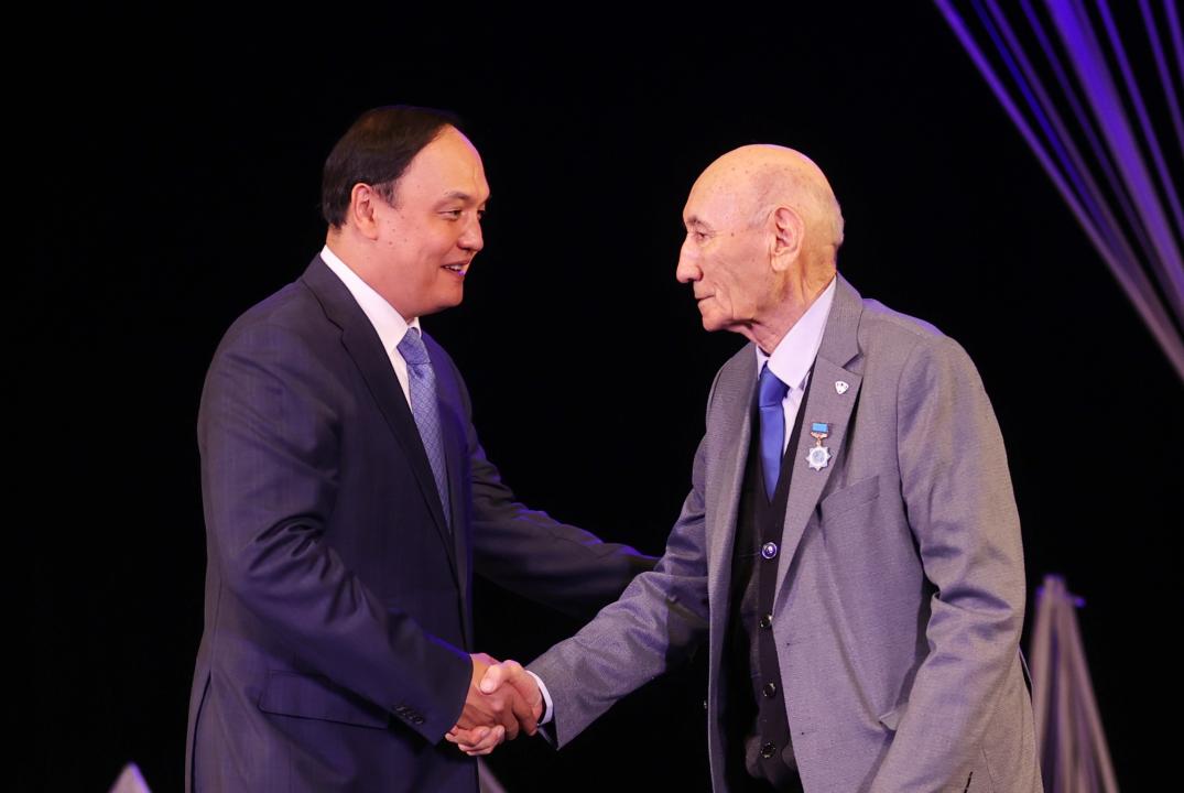 Ербол Қарашөкеев мерейтой иесінің иығына шапан жауып, жамбылдықтардың атынан құрмет көрсетті.