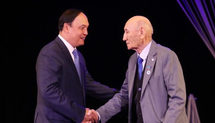 Ербол Қарашөкеев мерейтой иесінің иығына шапан жауып, жамбылдықтардың атынан құрмет көрсетті.