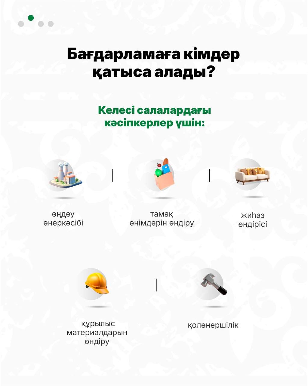 Бағдарлама шағын және шағын бизнесті қолдап, кәсіпкерлердің қаржыға қолжетімділігін кеңейтуге бағытталған.