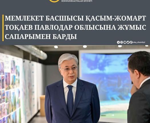 📣 Мемлекет басшысы Қасым-Жомарт Тоқаев Павлодар облысына жұмыс сапарымен барды бастыБАСТЫ ЖАҢАЛЫҚ By shanyraq08 On Авг 9, 2023 0 Бөлісу Президенттің сапары Екібастұз жылу электр орталығындағы жөндеу жұмыстарымен танысудан басталады. Сонымен қатар Мемлекет басшысы өңірдегі бірқатар өндірістік, әлеуметтік нысанды аралап көреді деп жоспарланып отыр. Жамбыл облысының Өңірлік коммуникациялар қызметі 0 Бөлісу