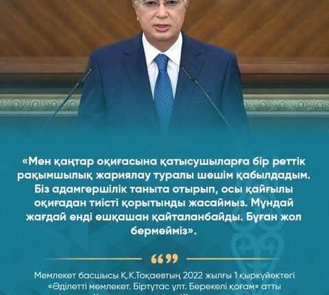 Мемлекет басшысы Қасым-Жомарт Тоқаевтың 2022 жылғы 1 қыркүйектегі Жолдауынан: БАСТЫ ЖАҢАЛЫҚ By shanyraq08 On Ноя 3, 2022 0 Бөлісу «Мен қаңтар оқиғасына қатысушыларға бір реттік рақымшылық жариялау туралы шешім қабылдадым. Біз адамгершілік таныта отырып, осы қайғылы оқиғадан тиісті қорытынды жасаймыз. Мұндай жағдай енді ешқашан қайталанбайды. Бұған жол бермейміз» 0 Бөлісу