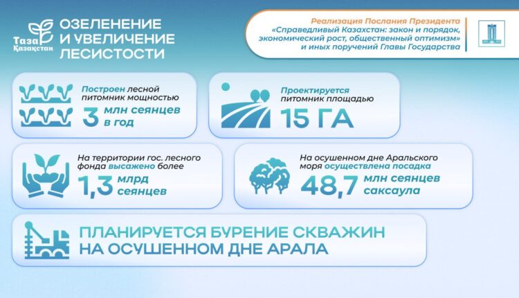 «На территории государственного лесного фонда высажено более 1,3 млрд сеянцев, в том числе на осушенном дне Аральского моря осуществлена посадка 48,7 млн штук сеянцев саксаула»,