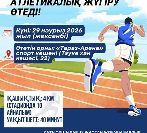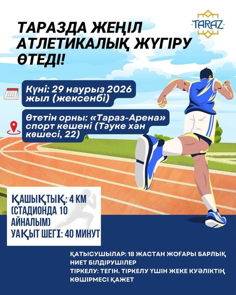 Таразда жеңіл атлетикалық жүгіру өтеді! Жаңалықтар By shanyraq08 On Мар 26, 2026 0 Бөлісу Күні: 29 наурыз 2026 жыл (жексенбі) Өтетін орны: «Тараз-Арена» спорт кешені (Тәуке хан көшесі, 22) Кесте: * 09:30 — Тіркелудің басталуы * 11:00 — Сөре (Старт) Маңызды ақпарат: Қашықтық: 4 км (стадионда 10 айналым). Уақыт шегі: 40 минут. Жарысқа 18-29, 30-39, 40-49, 50-59, 60-69, 70-79 және 80 жастан жоғары барлық ниет білдірушілер қатыса алады. Тіркелу: ТЕГІН. Тіркелу үшін жеке куәліктің көшірмесі қажет. Марапаттау: Әр жас санатындағы ерлер мен әйелдер арасындағы 1-3 орын иегерлері медальдармен, дипломдармен және естелік сыйлықтармен марапатталады. Тараз қаласының әкімдігі 0 Бөлісу